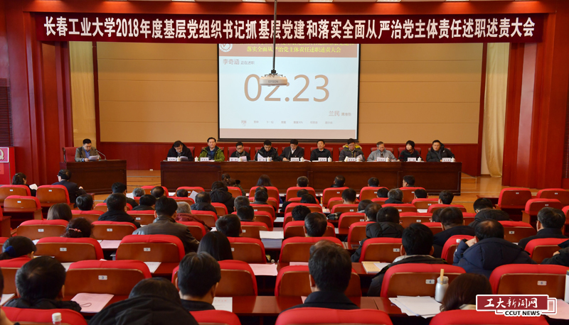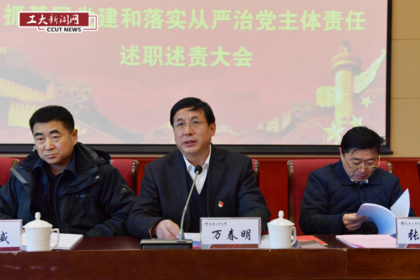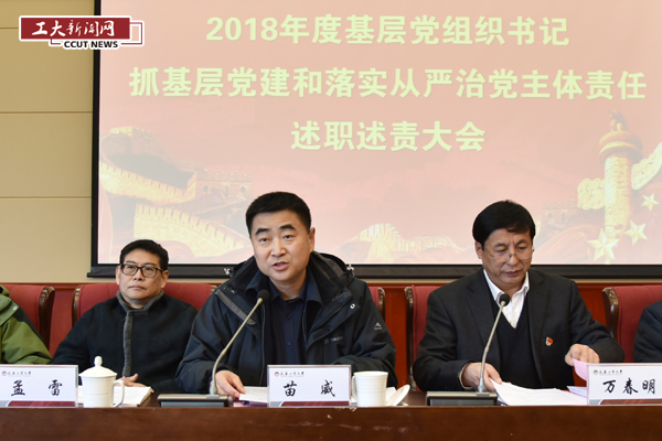 新闻网讯(通讯员 徐建伟)1月9日,学校在学术报告厅召开2018年度基层党组织书记抓基层党建和落实全面从严治党主体责任述职述责大会。校领导、党委常委、党委委员、纪委委员,党建工作领导小组成员,各基层党委(党总支、直属党支部)书记,正处级干部,省市“两代表一委员”等代表参加了会议。省委教育工委安全稳定工作部部长苗威全程参加会议并指导工作。党委书记万春明主持会议。