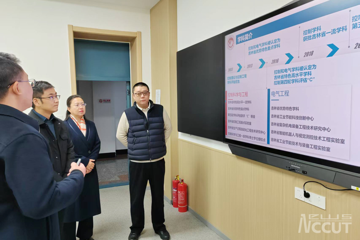 交流会前,汪飞一行来到电气与电子工程学院参观机器人研发情况,并听取电气与电子工程学院院长董博对学院发展情况介绍。