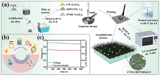 课题组聚焦“提升水伏器件功率密度”目标,设计出不对称三明治结构器件:以CNTs/CB/PVDF修饰碳布为顶电极,铝片为底电极,多孔滤纸为分隔层。通过等离子体处理增强电极亲水性,结合碳纳米材料的高比表面积与金属电极的高电势差,器件在室温下实现0.71 V开路电压、700 μA/cm²电流密度,峰值功率密度达124.5 μW/cm²(体积功率密度2075 μW/cm³),刷新同类器件纪录。