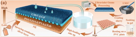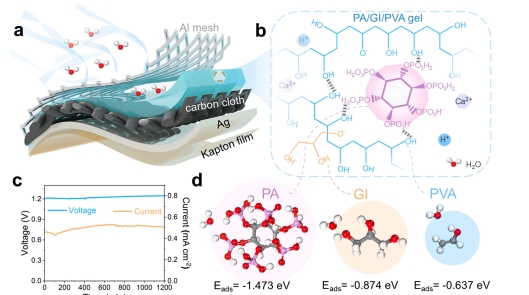 团队开发“自储水型SWS-MEG”,以PSS/GO/GI/PVA@Fab为质子释放层,锡铋合金液态金属负载石墨纤维为储水电极。器件摆脱对高湿度依赖,在15% RH、25℃下,储水后输出0.55 V电压、7.08 μA电流,功率密度1.14 μW/cm²,且在- 17.3~71.8℃宽温域稳定工作,可集成于口罩监测呼吸、利用汗液发电,实现“自供电健康监测”。