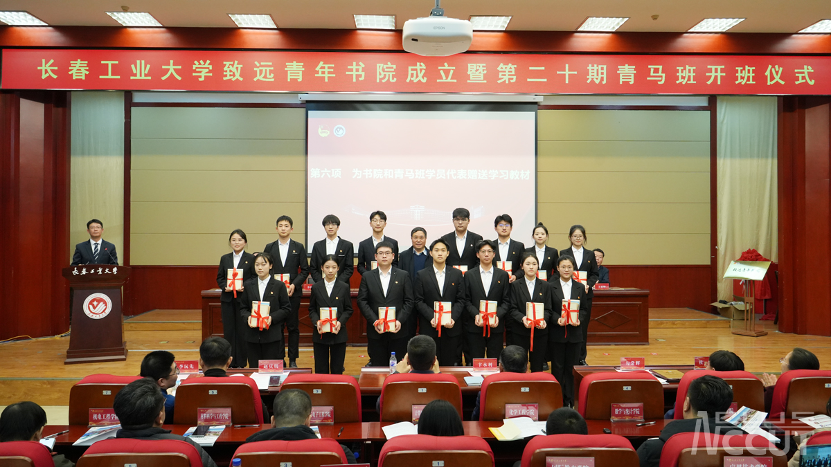 仪式上,马景惠与陈权共同为致远青年书院揭牌;李东玲为致远青年书院导师团颁发聘书;李廷吉为致远青年书院及青马班学员代表赠送学习教材;党委常委宣传部部长王亚坤宣读《长春工业大学致远青年书院首期培训班培养方案》;团委书记邵捷宣读《关于成立长春工业大学致远青年书院的决定》;长春致远新能源装备股份有限公司运营副总经理,机电工程学院97级校友勾常辉与数学与统计学院学生迟雯博分别作为导师代表和学员代表作交流发言。