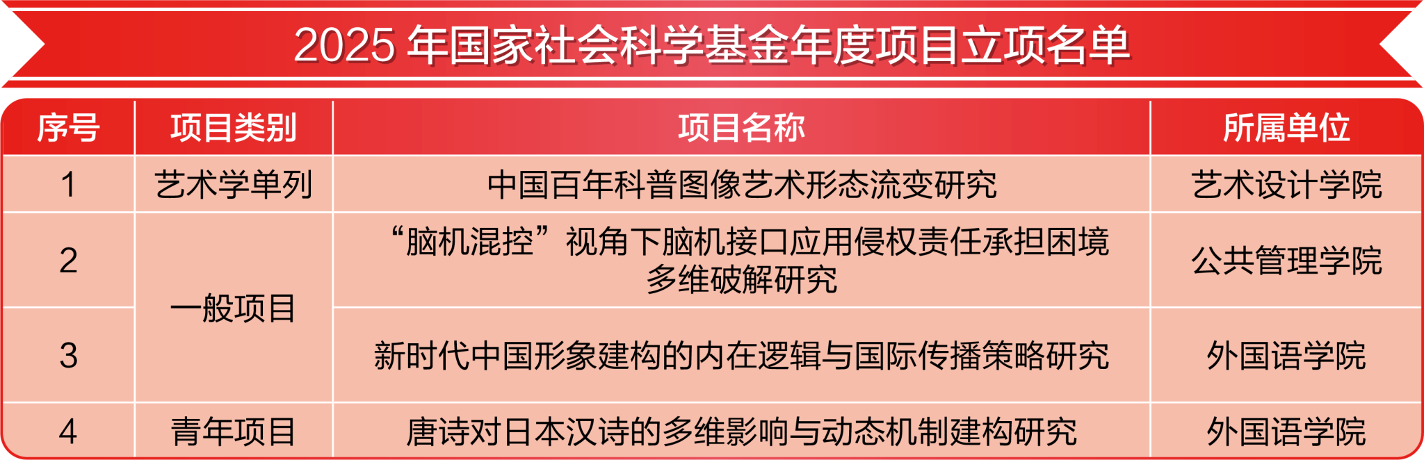 获批国家社科基金项目4项,包括一般项目3项,青年项目1项,位列吉林省省属高校第三。其中,国家社会科学基金艺术单列项立项1项,实现了学校国家社科基金艺术学单列项“零突破”,吉林省共两个高校获批此类项目,我校是省属院校唯一立项单位。