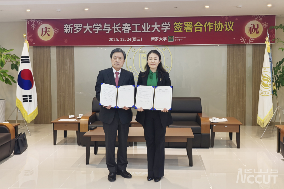 李东玲与新罗大学校长许南值共同签署两校合作框架协议,并就学科交叉工作坊、跨学科实验平台建设等合作方向、教师研修等事宜展开探讨。