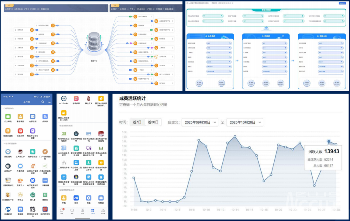 应用服务与数字资源是数字校园价值实现的关键载体。学校聚焦教学、科研、管理、服务等核心业务,推动信息技术与教育教学深度融合,构建起“一站式”服务体系。业务系统建设实现全覆盖,成功上线大学工系统,整合学生从入学到毕业全周期管理流程;人力资源管理系统实现招聘、绩效、薪酬等业务线上化;科研管理系统升级后支持项目申报、经费管理、成果转化全流程追踪;本专科及研究生教务管理系统完成迭代,实现排课、选课、成绩管理智能化;图书馆学习空间智慧管理平台上线,通过座位预约、资源导航等功能提升空间利用效率。统一服务能力显著增强,数据中台整合全校12个业务系统数据,建立标准数据接口56个,实现师生基本信息、课程成绩等核心数据的实时共享;打造“企业微信+统一身份认证+信息门户”服务矩阵,全面整合了各类师生服务事项,实现了办事流程的集中受理与协同处理,师生办事效率获得大幅提升。通过系统性地梳理与重构业务流程,全面推动了管理工作的数字化转型,更新后的协同办公系统支持流程自定义;“办事大厅”,实现了“数据多跑路,师生少跑腿”。财务管理迈入“无纸时代”,财务及校内金融业务平台实现报销单线上填写、电子发票自动识别、审批流程智能流转,资金收缴退付全流程数字化处理,年均处理报销业务4.2万笔。教学资源建设焕发新活力,引入虚拟仿真、增强现实、人工智能等新技术教学资源120余套,与超星、智慧树等平台合作引入优质课程资源3000余门,建成“吉林省专业技术人员继续教育网络平台”,年培训规模突破5万人次,形成了覆盖学历教育与非学历教育的多元化资源体系。